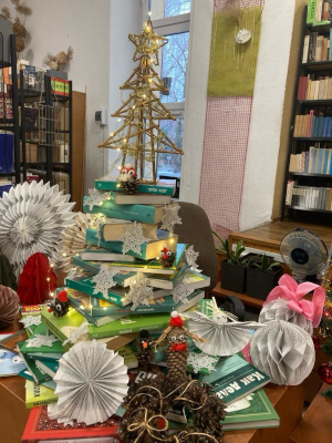 Święta Bożego Narodzenia zbliżają się wielkimi krokami. Czas przedświąteczny to pora tworzenia okolicznościowych dekoracji. Jest to też świetna okazja, aby pokazać swoje artystyczne umiejętności. Korzystając ze świątecznej atmosfery w bibliotece szkolnej zorganizowano warsztaty pt. „Choinka ze starej książki”. Uczennice z klasy 3 LT pod czujnym okiem nauczycieli bibliotekarzy własnoręczne przygotowały niezwykłe dekoracje, które przyozdobiły pomieszczenia biblioteki szkolnej. W bibliotece stanęła też nietypowa
