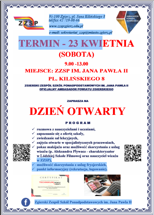 Zapraszamy na Dni otwarte w naszej szkole 23 kwietnia 2022 w godzinach 9-13