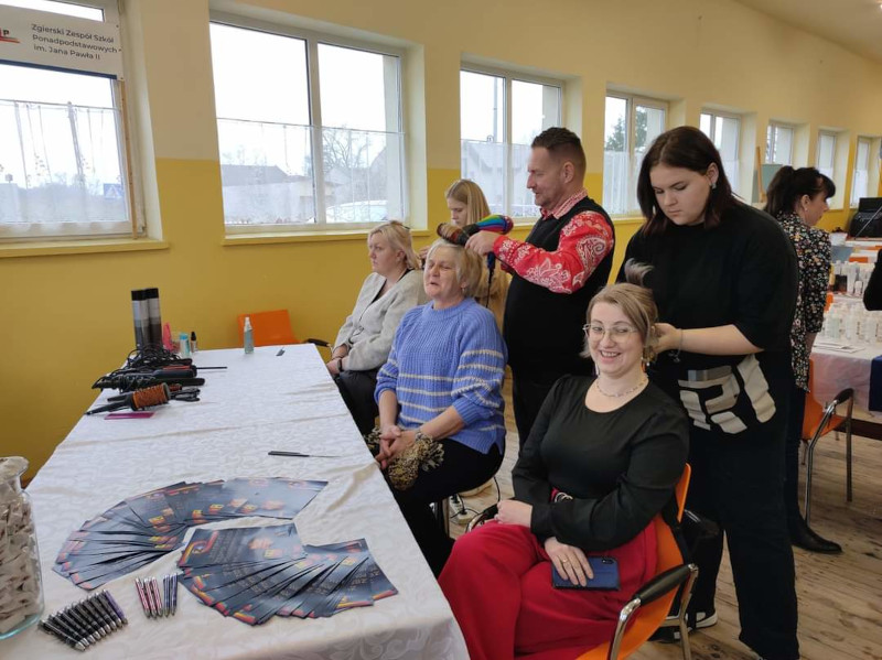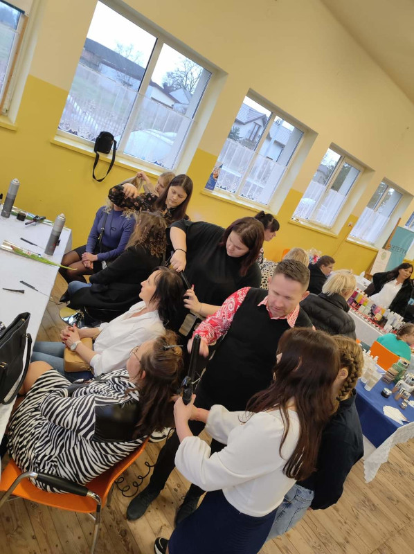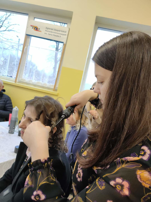 Wielkimi krokami zbliża się Dzień Kobiet. Z tej okazji nasza ekipa fryzjerska ruszyła w teren. Na zaproszenie Gminy Ozorków mieliśmy przyjemność umilić popołudniowe spotkanie dla kobiet z miejscowości Modlna. Atrakcji było co niemiara: porady dietetyka, prezentacja kosmetyków, badanie trychologiczne skóry głowy, zabiegi pielęgnacyjne na twarz. Całość dopełniały fryzury, nad którymi pracowały uczennice naszych klas fryzjerskich. W stylizacjach królowały loki w ciekawych formach. Fryzury były indywidualnie dobierane do typu urody i stylu każdej pani. Nasze uczennice służyły także poradami z zakresu fryzjerstwa, podpowiadały swoim klientkom jak właściwie dbać i pielęgnować włosy i skórę głowy. Atmosfera była przesympatyczna i wszystkie panie bardzo zadowolone ze swoich stylizacji.