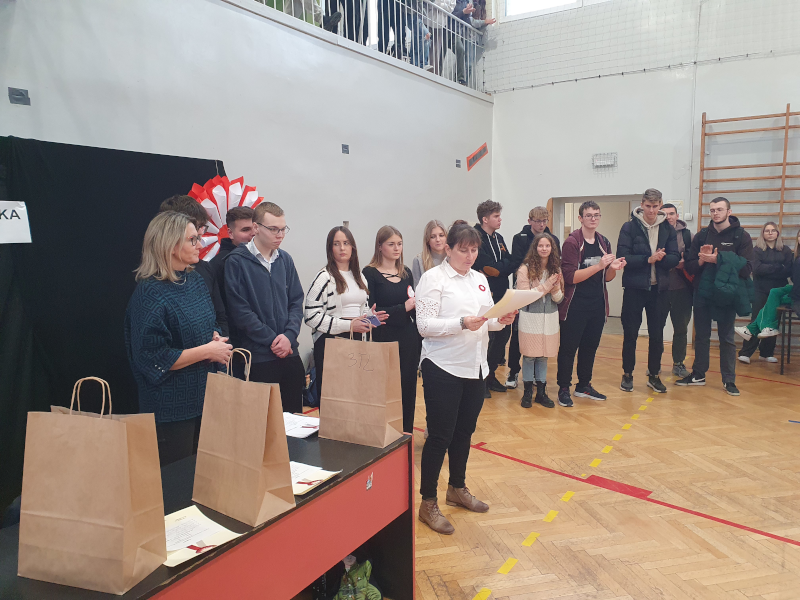W ramach obchodów Święta Niepodległości w szkole została przeprowadzona gra o tematyce niepodległościowej. Wzięły w niej udział 5 – osobowe zespoły z 16 klas z technikum i szkoły branżowej. Drużyny rywalizowały ze sobą rozwiązując zadania w siedmiu punktach przygotowanych na sali gimnastycznej. Tematyka gry obejmowała: Legiony Polskie, Ojców Niepodległości, utwory o tematyce legionowej, kalambury czy układanie puzzli przedstawiające walkę o granice II Rzeczypospolitej.
