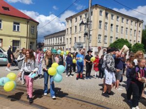 Następnie wszyscy uczestnicy wspólnie przemaszerowali ulicami Zgierza barwnym korowodem przy dźwiękach muzyki „uwalniając książki” poprzez wręczanie ich mieszkańcom Zgierza.