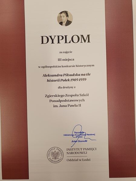 Drużyna w składzie: Kamila Andrzejczak, Ksawery Kowalczyk i Hubert Rybiński z klasy 4TAP zajęła III miejsce w ogólnopolskim konkursie historycznym „Aleksandra Piłsudska na tle historii Polek 1905-1939”, którego organizatorem jest OBEN IPN Łódź.
