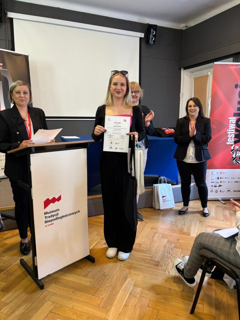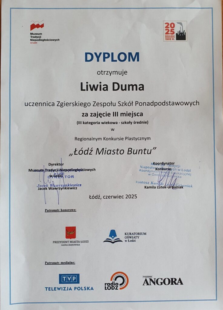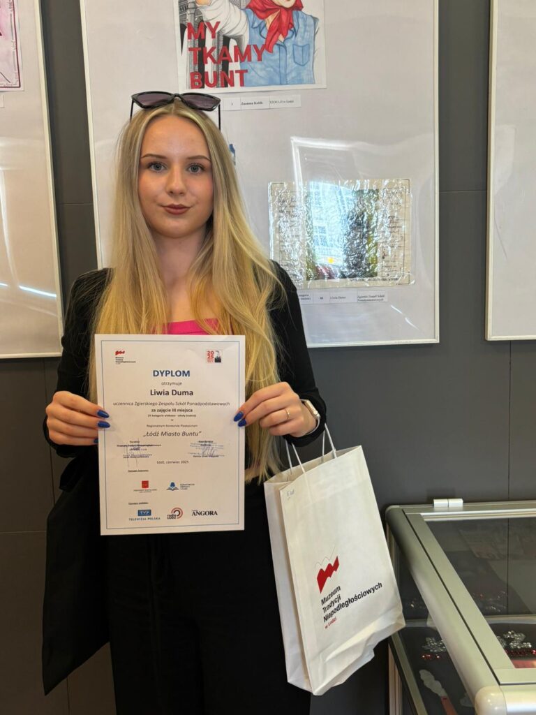 Liwia Duma, nasza tegoroczna absolwentka z klasy 5TEL, zajęła III miejsce w regionalnym konkursie plastycznym ” Łódź – miasto buntu.” Konkurs zorganizowało Muzeum Tradycji Niepodległościowych w Łodzi przy ulicy Gdańskiej z okazji Roku Rewolucji 1905 roku, której 120. rocznicę obchodzimy w tym roku. Gratulacje!