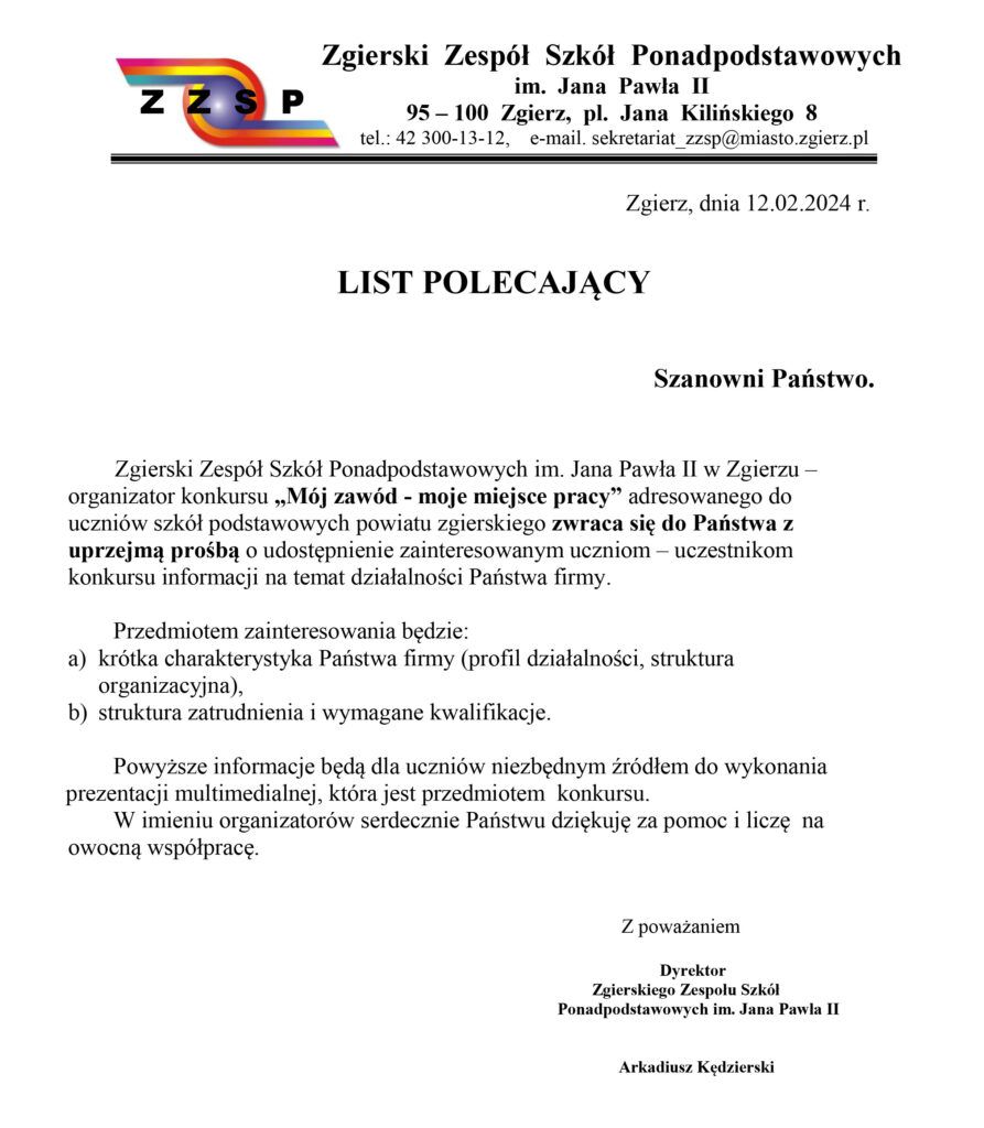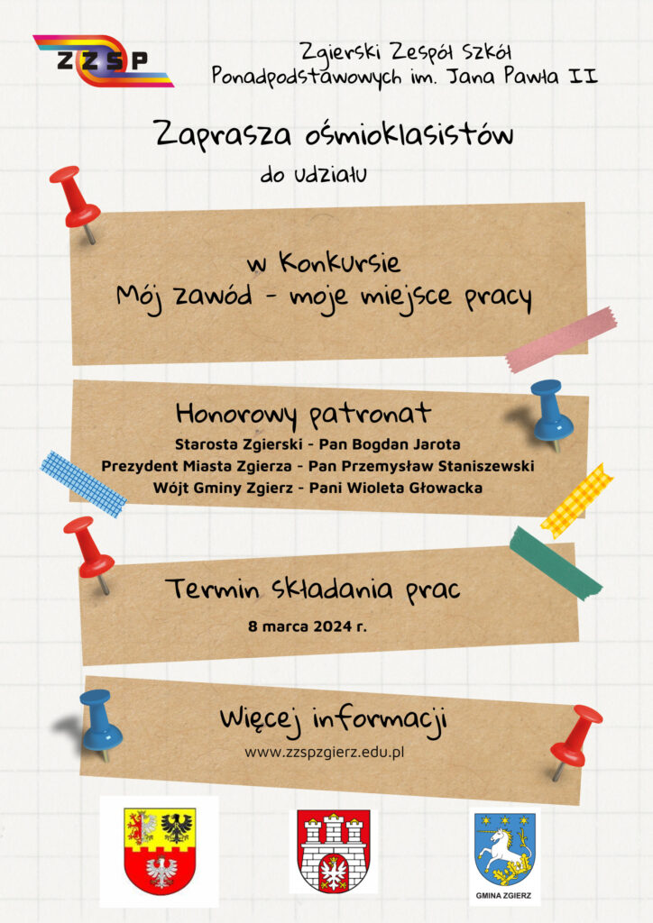 Organizatorem konkursu „Mój zawód- moje miejsce pracy” jest Zgierski Zespół Szkół Ponadpodstawowych im. Jana Pawła II w Zgierzu.