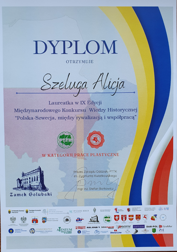 Alicja Szeluga z klasy 5TOF została laureatką w IX Edycji Międzynarodowego Konkursu Wiedzy Historycznej “Polska – Szwecja, między rywalizacją a współpracą” w kategorii prace plastyczne. Uroczysta gala finałowa, podczas, której wręczano nagrody, odbyła się w zbudowanym w XIV wieku przez Krzyżaków Zamku Golubskim. Alicja odbierała nagrodę wraz ze swoim opiekunem panią Beatą Rybarczyk.