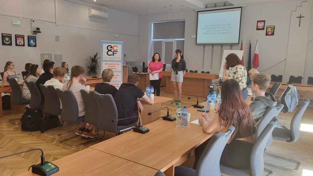 . Uczniowie poznali zasady prowadzenia mediacji oraz cechy dobrego mediatora. Mieli okazję wcielić się w rolę mediatora i doprowadzić do porozumienia między zwaśnionymi kolegami. Uczniowie zdobyli ogrom wiedzy, a przy tym doskonale się bawili. Dzięki takim zajęciom szkoła zdobyła wsparcie wśród uczniów, którzy z powodzeniem mogą być mediatorami w konfliktach koleżeńskich. Warsztaty zakończyły się rozdaniem certyfikatów dla każdego uczestnika.W warsztatach brali udział: Dawid Jezierski, Kacper Ptaszyński i Filip Klimkiewicz.