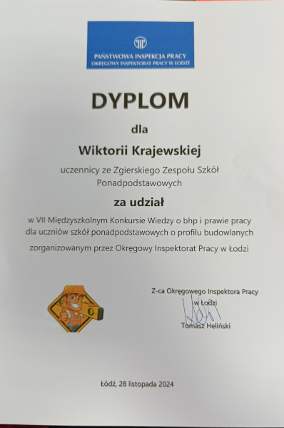 Celem konkursu jest upowszechnienie wiedzy na temat organizacji i bezpiecznej pracy w budownictwie, zwiększenie świadomości młodzieży o zagrożeniach występujących przy wykonywaniu robót budowlanych oraz wspieranie nauczycieli zawodu w przekazywaniu uczniom z klas przygotowujących do pracy w zawodach budowlanych wiedzy przepisów i zasad bezpiecznej pracy. Opiekunem uczennic była Pani Katarzyna Piątkowska.