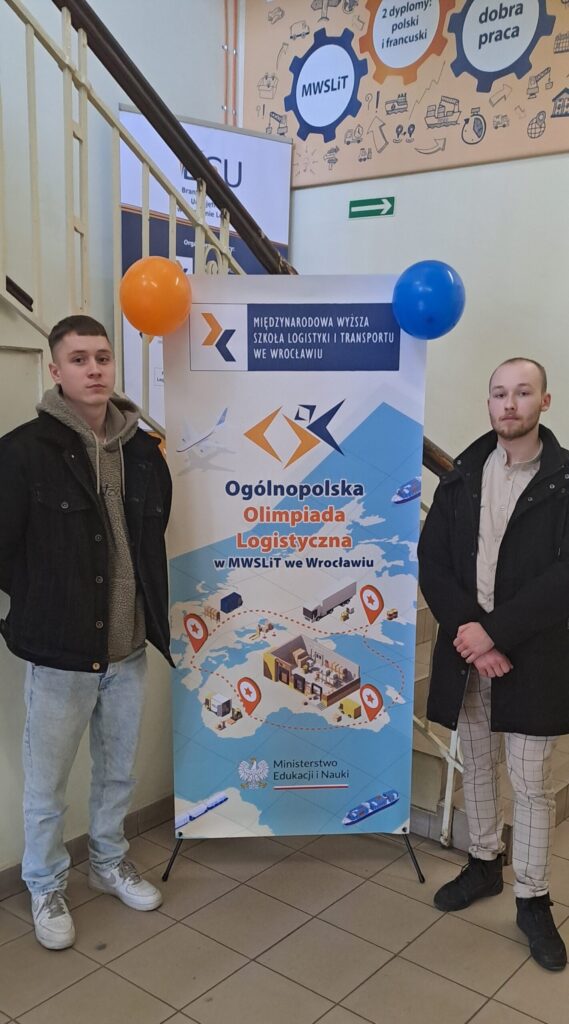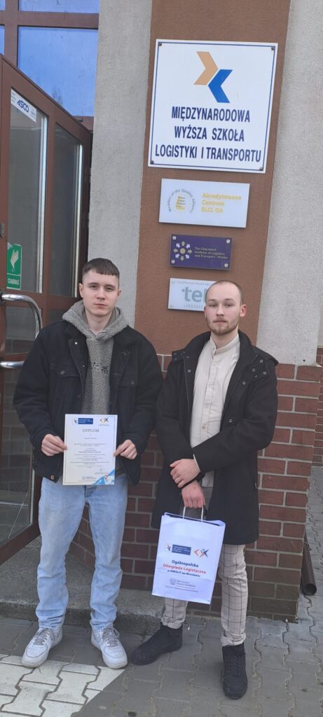 Dwóch uczniów naszej szkoły reprezentowała nas w tych trudnych zmaganiach- Kacper Nyczaj i Wojciech Kalinowski.Ich wiedza i umiejętności logistyczne pozwoliły im na udział w okręgowej Olimpiadzie Logistycznej zorganizowanej przez Międzynarodowa Wyższa Szkoła Logistyki i Transportu we Wrocławiu.