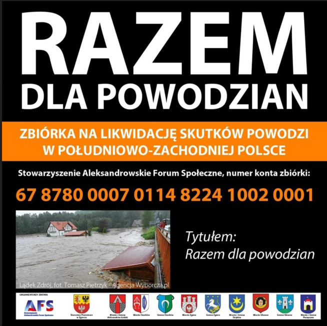 W związku z katastrofalnymi skutkami powodzi w południowo – zachodniej Polsce, wszystkie gminy i miasta powiatu zgierskiego łączą siły, aby wspierać potrzebujących.