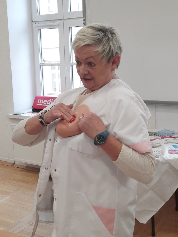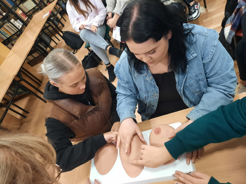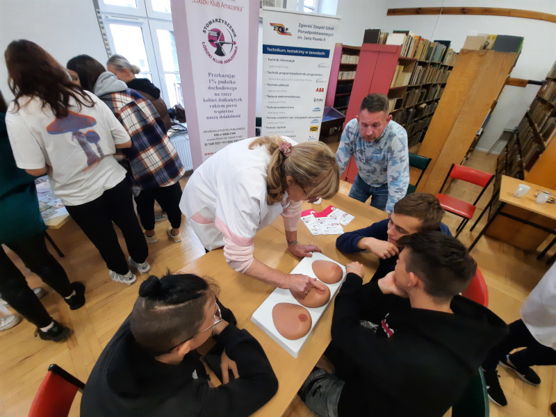 Nasza szkoła od wielu lat współpracuje z Stowarzyszenie Łódzki Klub Amazonka Wolontariuszki chętnie nas odwiedzają. Tym razem też nas nie zawiodły. Panie: Jadwiga Chruściel i Teresa Grabowska przeprowadziły prelekcję oraz warsztaty dla uczennic i uczniów klasy 3 TF i 4 BFp. Młodzież mogła wybadać guzki ukryte w fantomach. Duży nacisk położony został na regularne samobadanie piersi.
