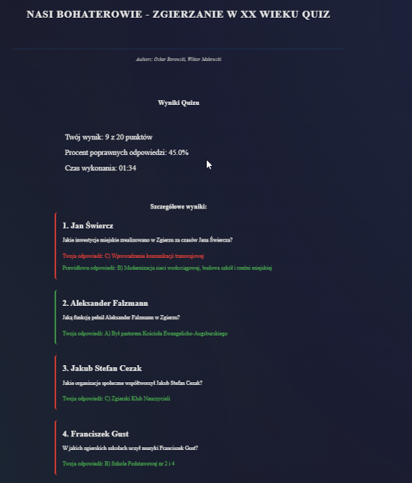 Podsumowaniem działań i zdobytych w czasie przygotowań do gry miejskiej i quizu informacji, jest stworzenie autorskiej gry planszowej pod tym samym tytułem, którą można wykorzystać na lekcjach historii aby poznać lokalnych bohaterów.