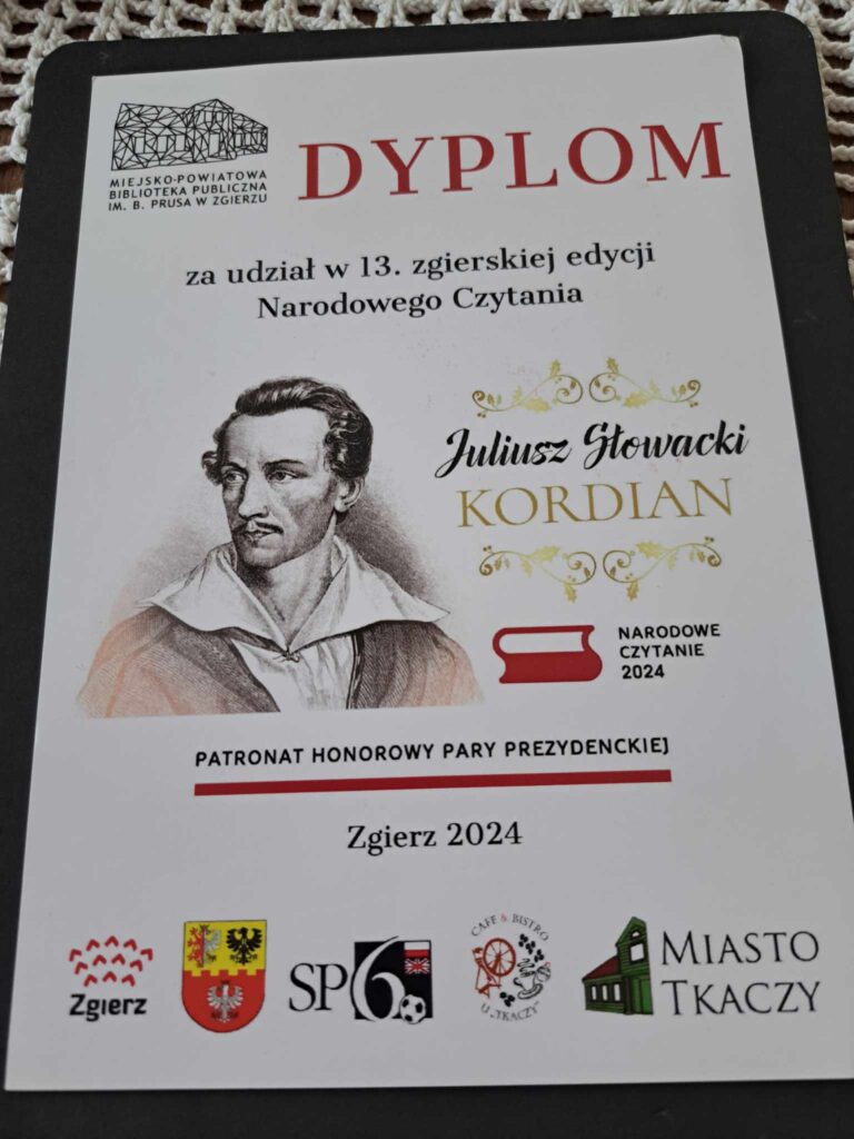 ,,Bohaterem,, dnia był dramat Juliusza Słowackiego ,,Kordian,,. Na scenie teatralnej przygotowanej przez Miejsko – Powiatową Bibliotekę Publiczną im. B. Prusa miłośnicy literatury czytali fragmenty romantycznego arcydzieła wykazując się talentami recytatorskimi.