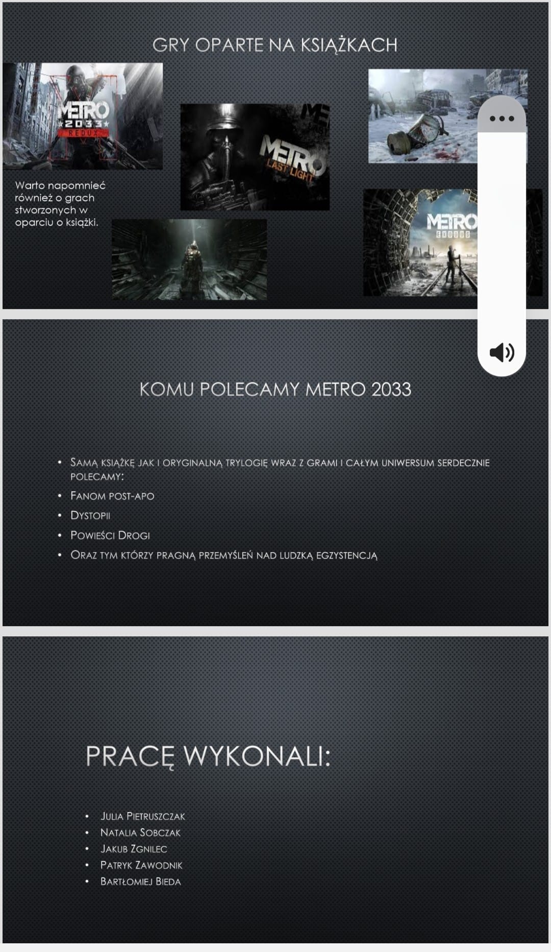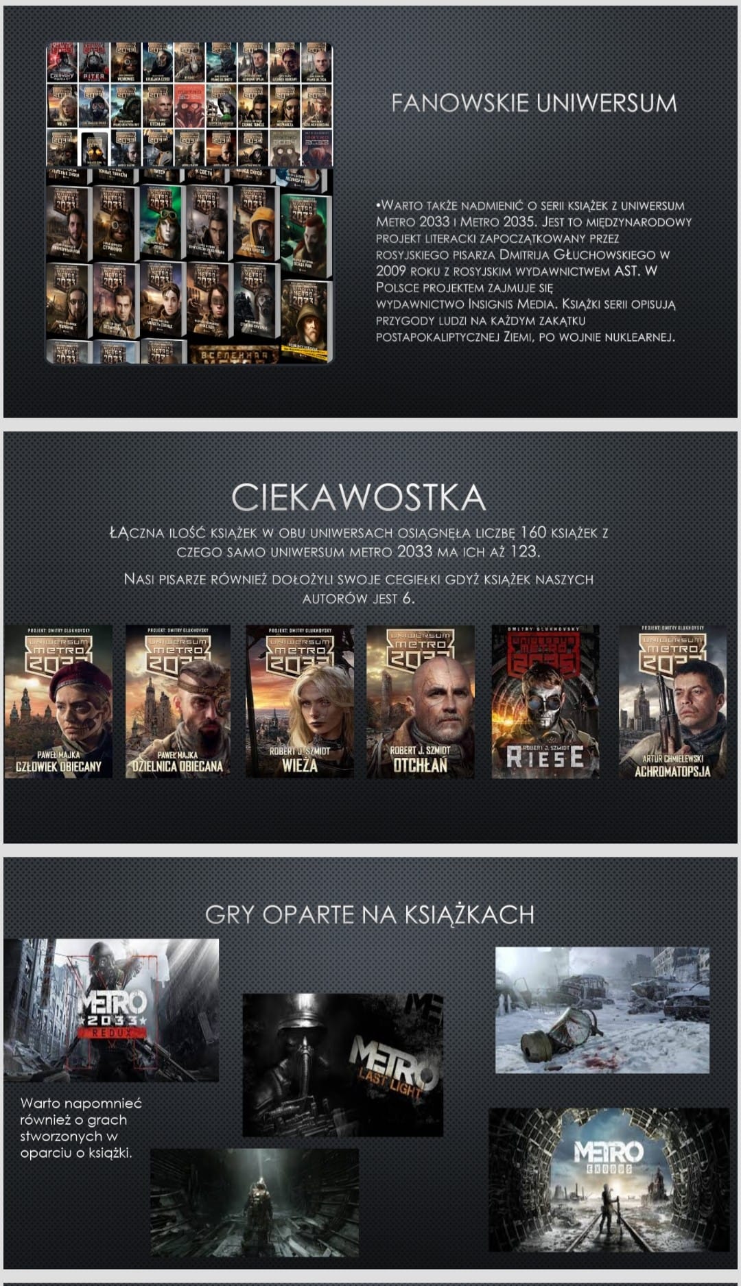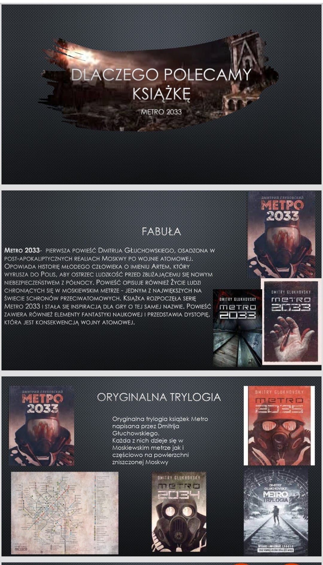„Książkę “Metro 2033” Dmitrija Głuchowskiego polecamy, ponieważ jest szczególnie ciekawa przez wzgląd na swoją fabułę jak i samo miejsce oraz czas akcji. Bohaterów jest wielu, mogą nas zaskoczyć swoim oddaniem w sprawie głównego antagonisty Artema jak również osobowością i charakterami. Swoje klimaty znajdą tu osoby lubiące książki o tematyce postapo, fantasy, filozofii jak i ci którzy zagłębiają się w mentalność współczesnych Rosjan”