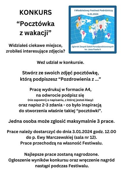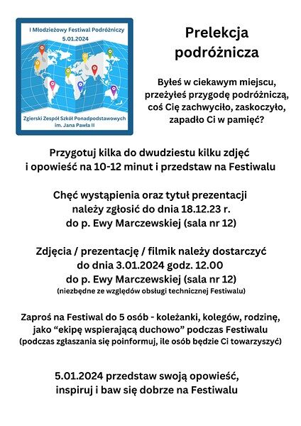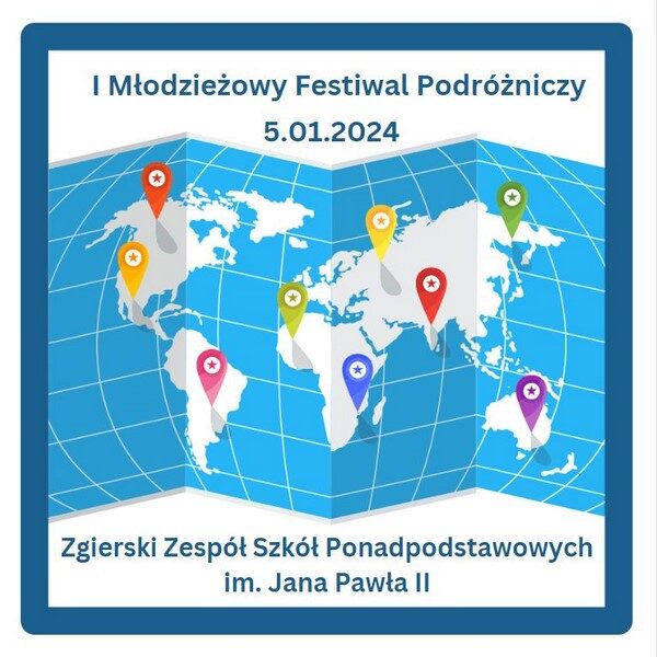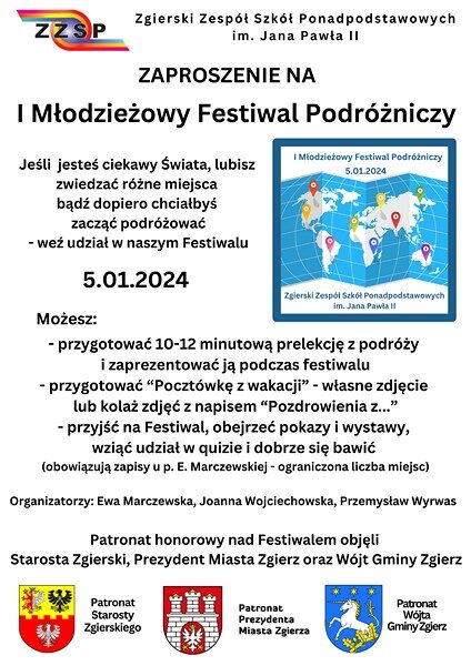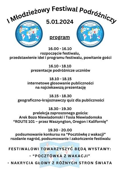 Zaproszenie na I Młodzieżowy Festiwal Podróżniczy Jeśli jesteś ciekawy świata, lubisz zwiedzać różne miejsca, bądź dopiero chciałbyś zacząć podróżować – weź udział w naszym Festiwalu. Więcej informacji znajdziesz na załączonych grafikach.