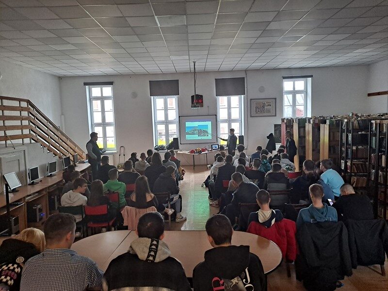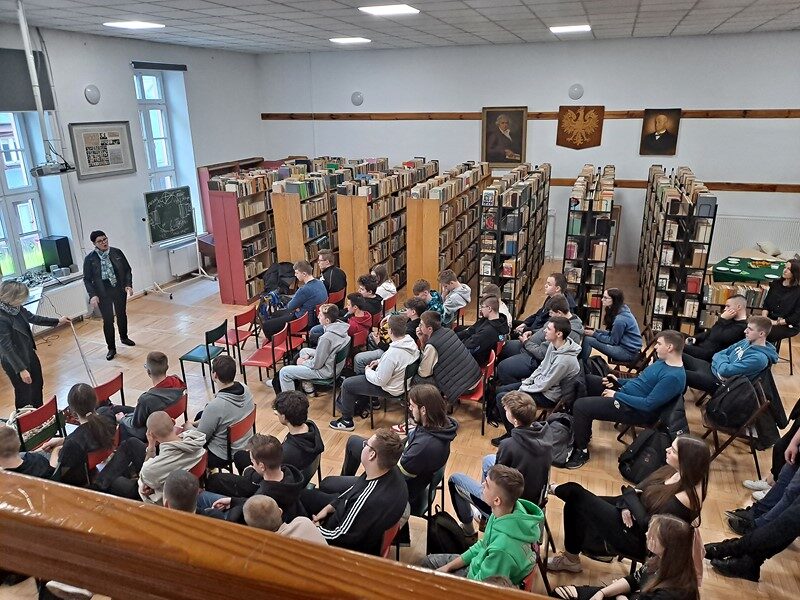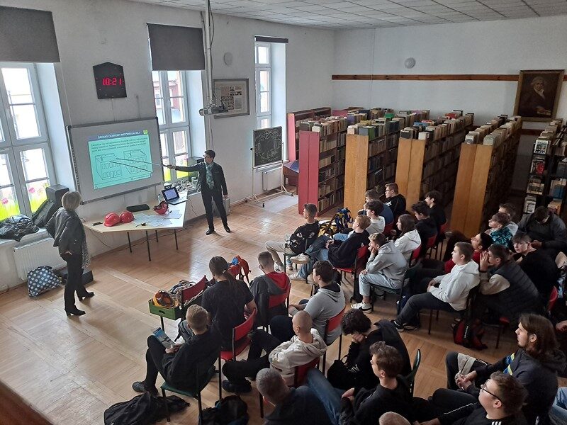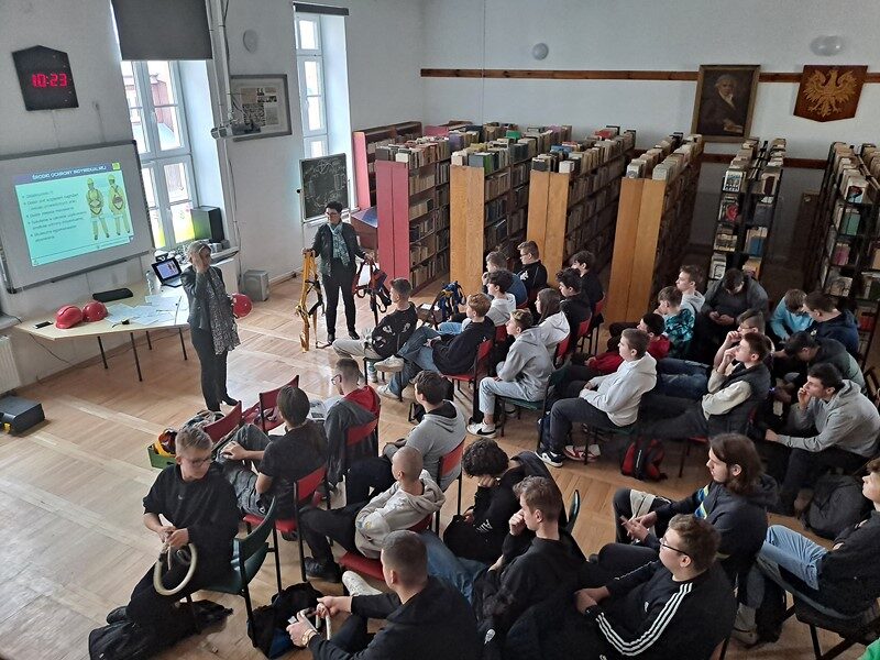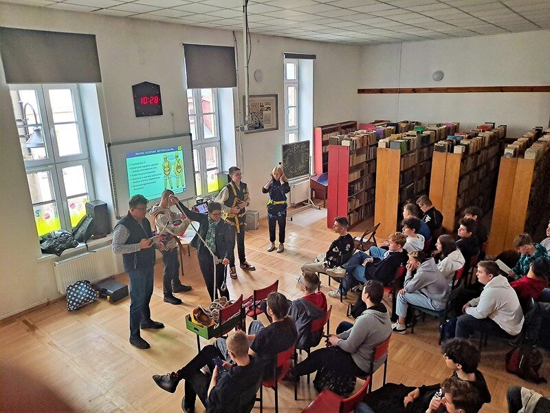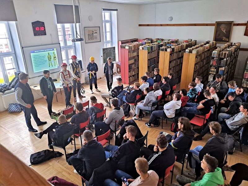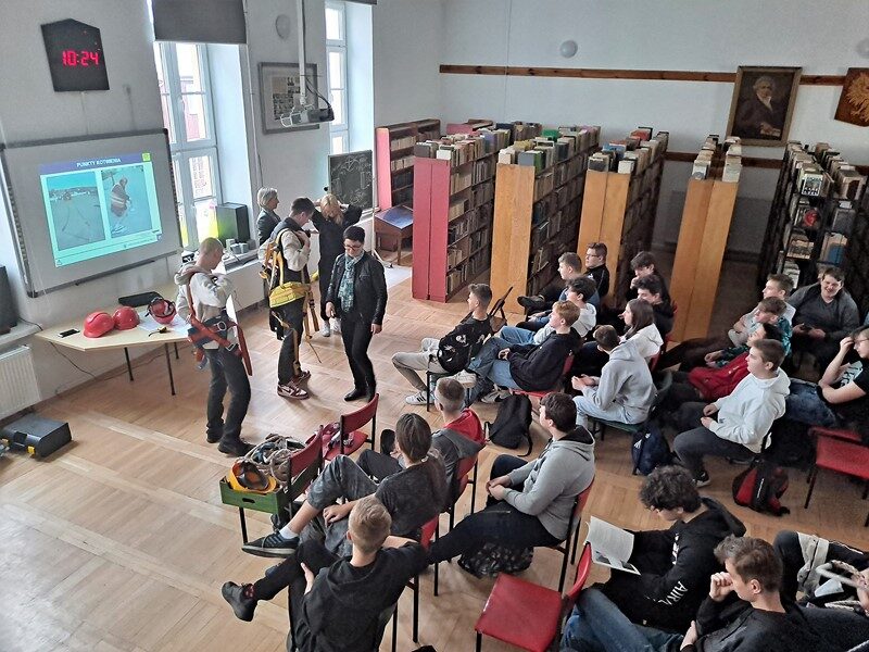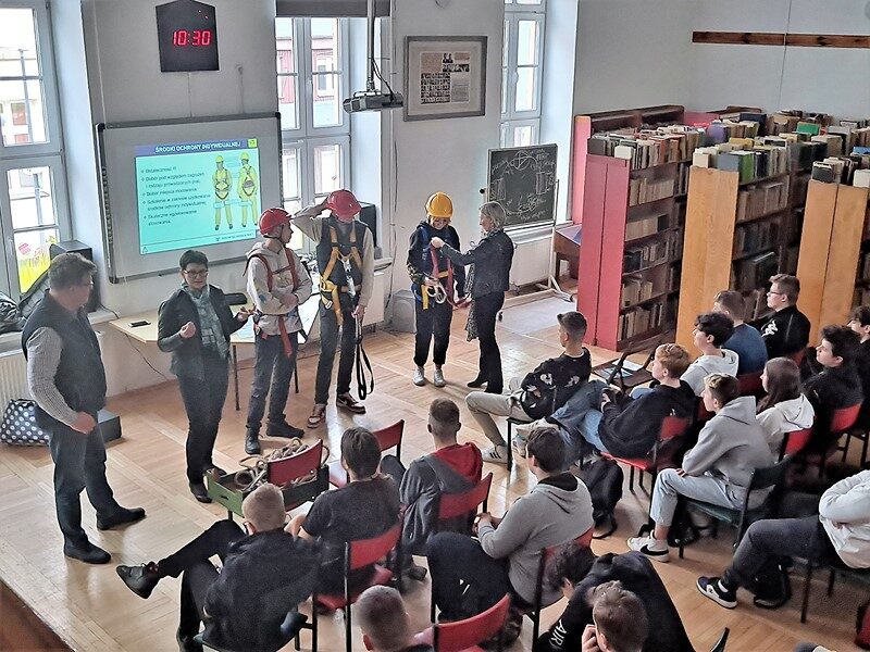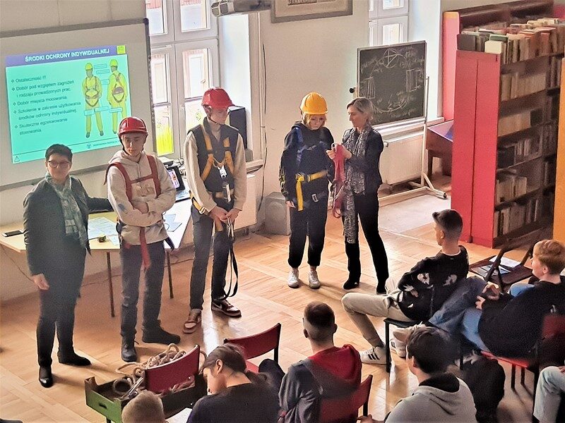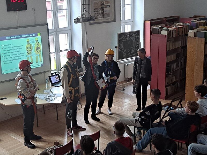 Bezpieczne użycie szelek bhp, linek i systemów samohamownych przy pracy w ograniczeniu, wybór punktów kotwiczenia, wygradzanie stref niebezpiecznych oraz sposoby bezpiecznej ewakuacji wiszącego pracownika – to niektóre z zagadnień omawianych podczas kolejnego szkolenia przeprowadzonego przez Panie inspektor z Państwowej Inspekcji Pracy w Łodzi dla uczniów technikum OZE naszej szkoły.