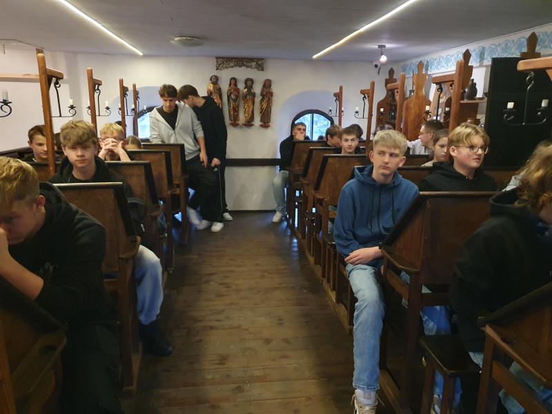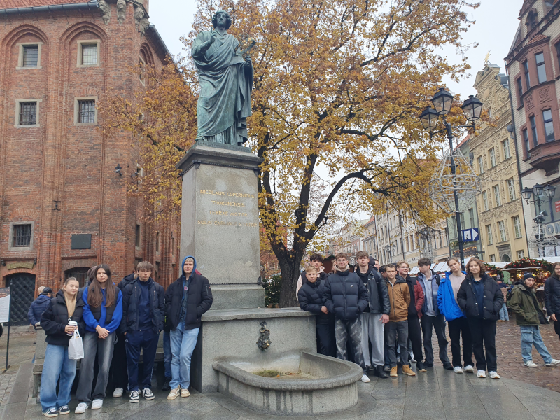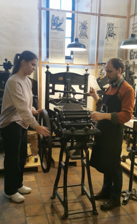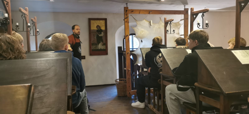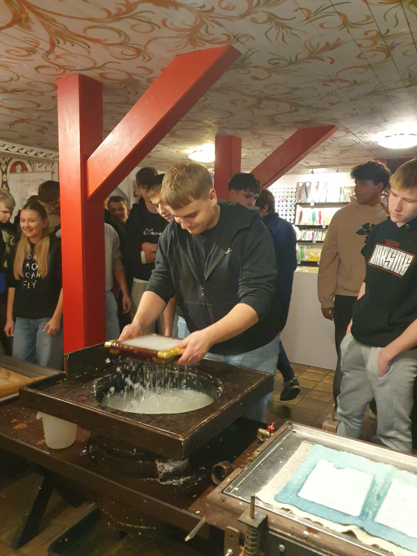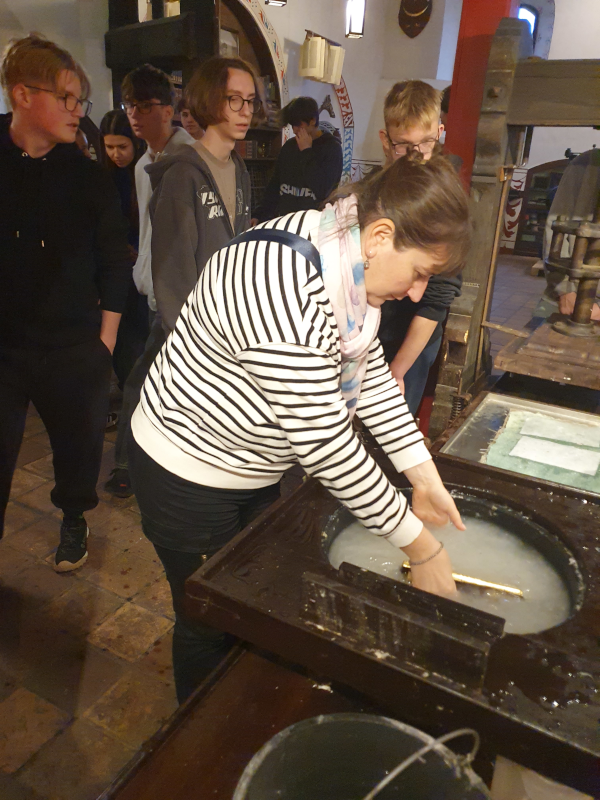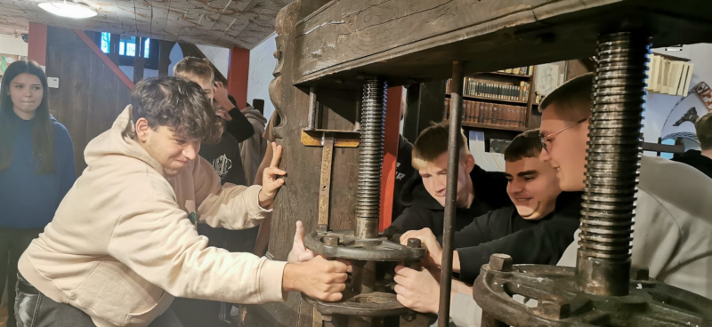 Uczniowie klasy 3TE, z koleżankami z klasy 3TL i 3IP, wybrali się na wycieczkę do Torunia i Grębocina pod opieką pani Beaty Rybarczyk i pani Katarzyny Orłowskiej. W Grębocinie odwiedzili Muzeum Piśmiennictwa i Drukarstwa, które mieści się w poewangelickim kościele św. Barbary z XIII wieku. Budowla jest w stylu gotyckim, a w jej wnętrzu znajdują się  unikatowe w Polsce zbiory pras drukarskich i eksponatów. Wnętrze podzielone jest na strefy: skryptorium, gdzie kiedyś skrybowie przepisywali księgi, część drukarska i miejsce przeznaczone do wyrabiania papieru. W takim wnętrzu można było przenieść się w czasie. Każdy uczestnik mógł pisać gęsim piórem, zanurzonym w kałamarzu z atramentem, wydrukować certyfikat na prasie drukarskiej z użyciem siły swoich mięśni oraz własnoręcznie wyprodukować kartkę papieru pod okiem pracownika muzeum.