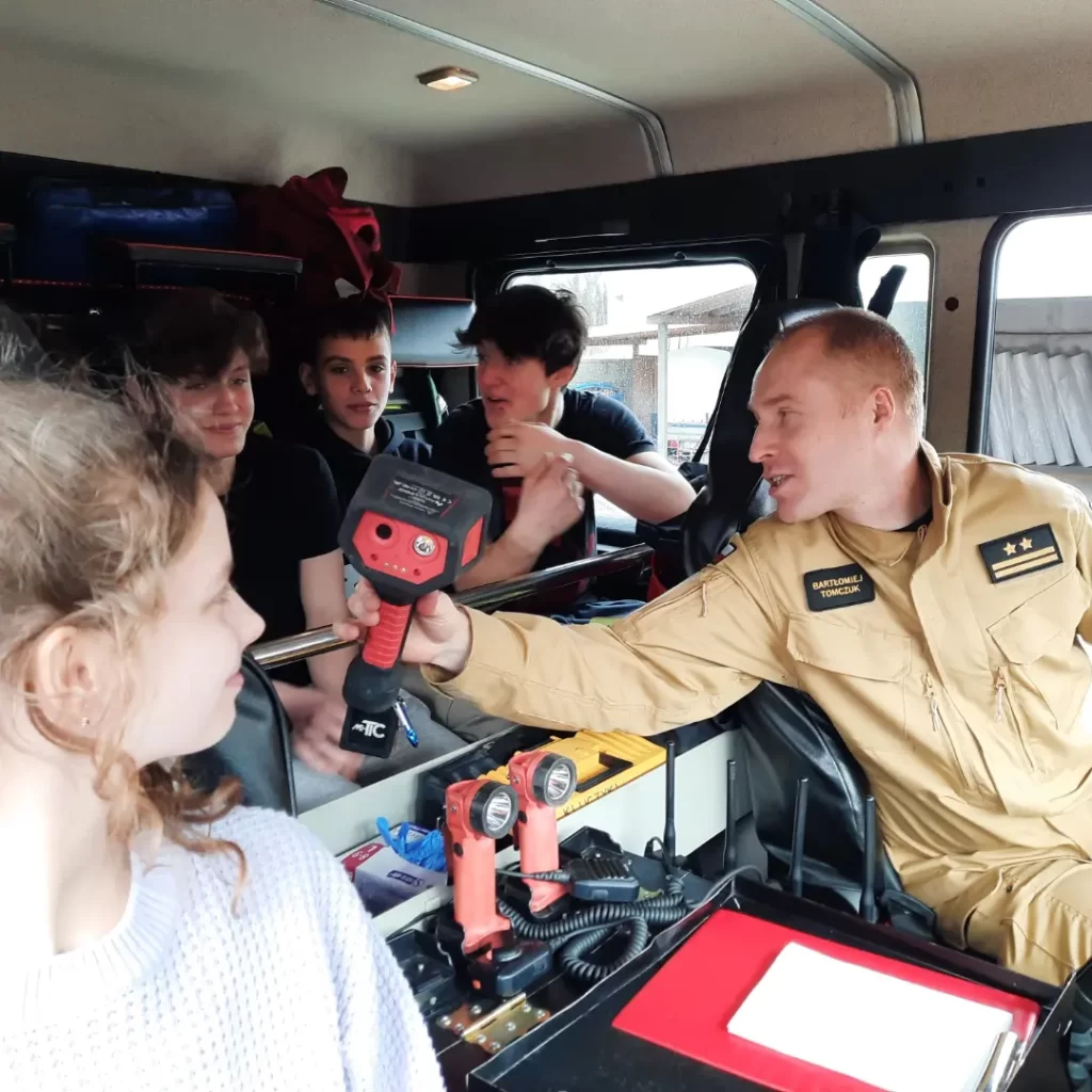 Młodzież miała też możliwość zwiedzenia budynku, a przy okazji obejrzenia stanowiska dowodzenia, którego pracę przybliżył sam dowódca Jednostki Ratowniczo- Gaśniczej bryg. mgr inż. Bartłomiej Tomczuk.