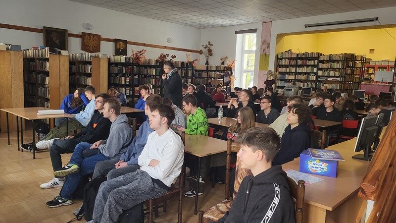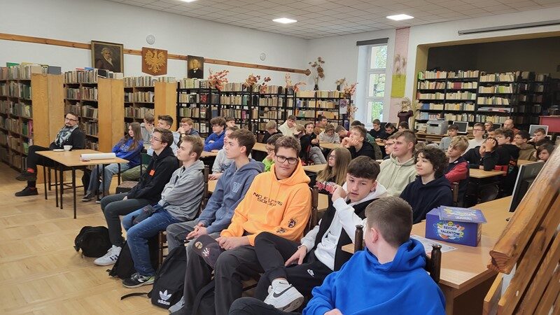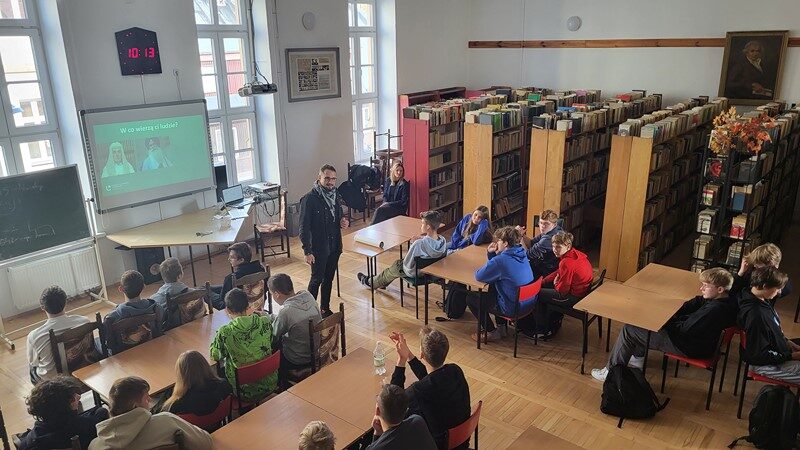 Po prelekcji pani Joanny, wykład poprowadził pan dr Roland Wójcik, historyk z UŁ. Wyjaśnił uczniom, że humaniści zajmują się kreowaniem, urządzaniem i tworzeniem świata. Zaprezentował znanych nam z mediów i polityki humanistów, którzy rządzą państwem. Włączył do dyskusji uczniów, kontynuując wykład pani doktor Joanny, że wszystkie nauki, nawet te ścisłe, wywodzą się z filozofii.