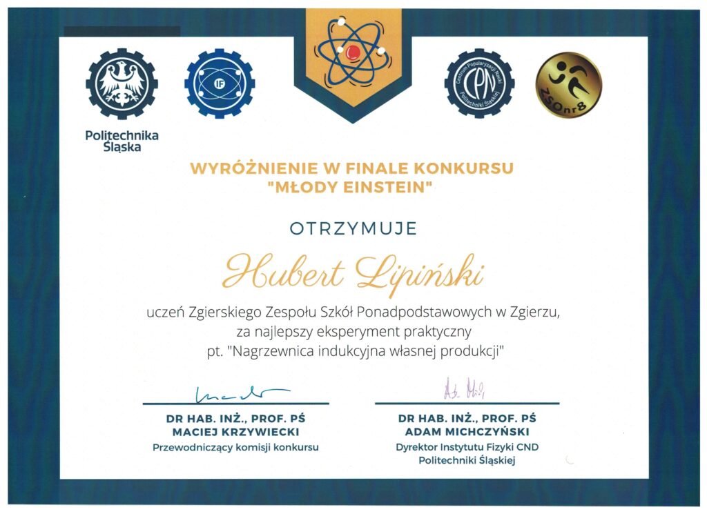 Zadaniem uczestników konkursu “Młody Einstein” jest przygotowanie w domu lub w szkole pracy z zakresu fizyki lub z pogranicza fizyki i innych dziedzin. Praca może mieć formę modelu, makiety, doświadczenia, pokazu, eksperymentu, urządzenia elektrycznego, urządzenia mechanicznego, projektu badawczego lub kombinacji tych elementów.