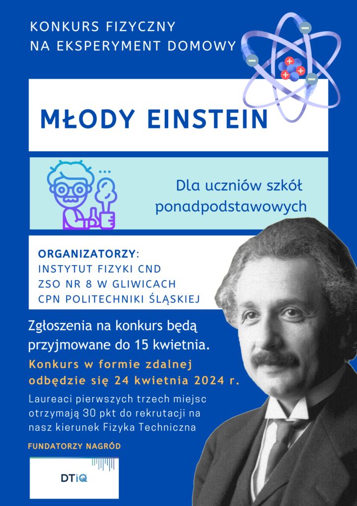 „Młody Einstein” to ogólnopolski konkurs fizyczny na eksperyment domowy organizowany dla uczniów szkół ponadpodstawowych przez Instytut Fizyki – Centrum Naukowo-Dydaktyczne Politechniki Śląskiej, Centrum Popularyzacji Nauki Politechniki Śląskiej oraz ZSO nr 8 w Gliwicach.