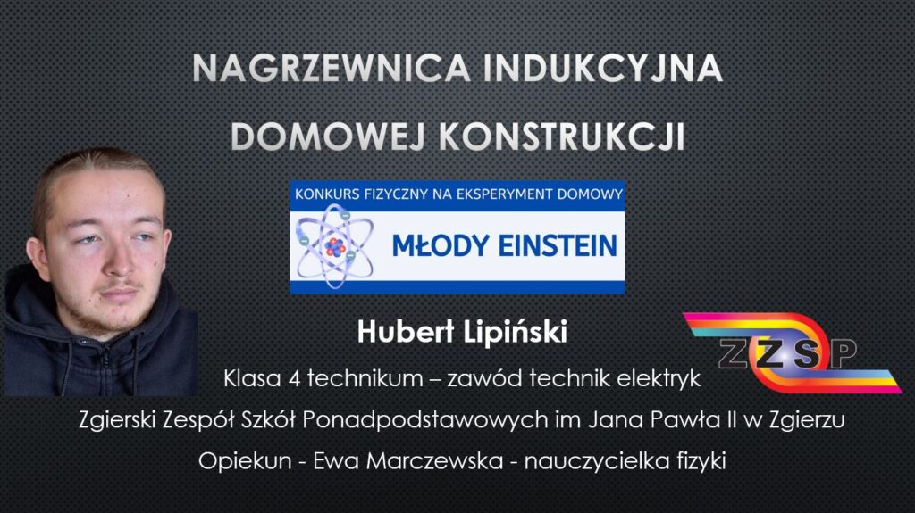 Zadaniem uczestników konkursu “Młody Einstein” jest przygotowanie w domu lub w szkole pracy z zakresu fizyki lub z pogranicza fizyki i innych dziedzin. Praca może mieć formę modelu, makiety, doświadczenia, pokazu, eksperymentu, urządzenia elektrycznego, urządzenia mechanicznego, projektu badawczego lub kombinacji tych elementów.