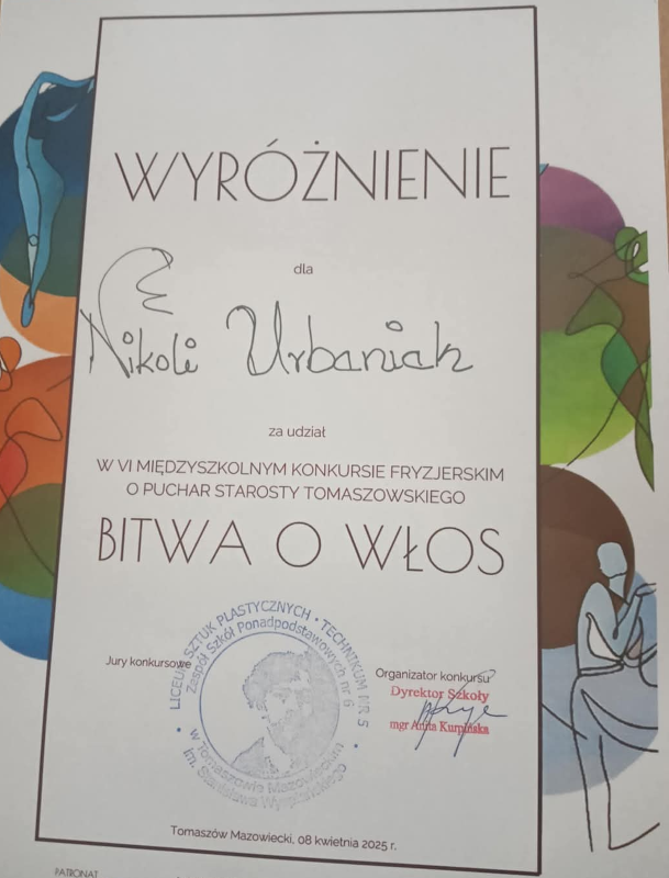 Nasza uczennica Nikola Urbaniak z klasy 2TOf zdobyła wyróżnienie w VI Powiatowym Konkursie Fryzjerskim o Puchar Starosty Tomaszewskiego “Bitwa o Włos”!